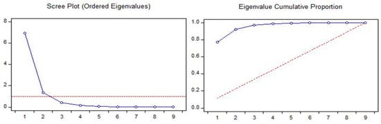 The principal component analysis of the estimated eigenvalues and eigenvectors can also be performed in EViews. We analyze nine indices, totaling 408 observations, from 2000 to 2023. The dispersion matrix and supporting data for a total of nine indicators (PC 1–9) are calculated using principal component analysis. Dissimilarity and fraction of total variance were summed up by the eigenvalues. However, the main components of the correlation matrices reveal that the combined scale variance of the indicators is 9. The length or size of an eigenvector is determined by its eigenvalue, which is a coefficient applied to the vector. Therefore, principal component analysis is a technique that calculates a covariance matrix to evaluate the degree to which each variable is correlated with all others [,,]. By employing eigenvectors as indicators, it is possible to determine the direction of this study’s data. Based on the data in Table 5, we can see that the first PCA (eigenvalue) explains 77.02% of the overall variance (6.931/9.00 = 0.7702), whereas the second PC explains just 15.18% of the whole variance (1.365/9.00 = 0.1518). Over 92% of the overall variation could be accounted for by the first two factors. The findings also back up the use of principal component analysis and principal axis rotation to shrink the size of the consumption and expansion dimensions. This means that the OECD may implement energy conservation and CO2 emissions reduction strategies without worrying about their negative consequences on the economy. The findings suggest that the CO2 emissions produced by building, transportation, and technological advancement are in turn generated by energy use.