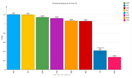 By arranging the X variables used for explanation and the Y variables used to display the results according to the VIP, the relative weight of each explanatory variable may be calculated. A VIP score greater than 1 indicates that this predictor is the most important one for depicting Y. The explanatory factors may be statistically significant in explaining the Y variable when the VIP value is greater than 1. Consequently, the explanatory variables’ statistical significance in the estimated model is not statistically significant if the VIP value is less than 0.5. Figure 8 illustrates the jackknife confidence interval in conjunction with the appropriate independent variables (PEC, OIC, GDP, POP, RGB, and NEC). Uncertainty bars are included in the graph that illustrates the plots to indicate this. If the statistical values exceed 1 and the VIP is less than 0.5, they are the most critical for comprehending Y.