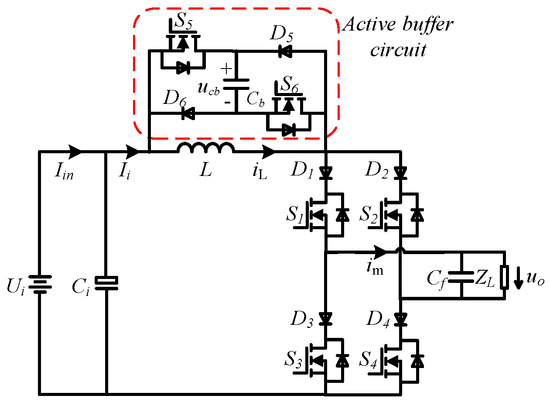 With the development of the global economy, the problem of energy crisis and environmental deterioration has become increasingly serious, and the new energy power generation system represented by fuel cells and photovoltaics has attracted more and more attention [1,2,3,4]. The output of photovoltaic cells and fuel cells are DC, and the voltage is low, the fluctuation range is large, and it is difficult to directly use; the booster inverter needs to convert DC power into AC power and transmit it to the grid or for loading. The single-phase inverter produces input current low-frequency ripples on the DC input side during normal operation, which affect the performance of the converter and cause some adverse harm and influence [5,6,7]. For example, in the application of fuel cell inverters, the input current low-frequency ripple increases the loss of the battery and reduces the efficiency and performance of the system [8]. When the photovoltaic is inverted, the low-frequency current ripple on the input side affects the MPPT of the photovoltaic cell and decreases the efficiency and energy utilization of the photovoltaic generation system [9,10,11,12,13,14]. The low-frequency ripple also has a certain impact on the power battery of electric vehicles [15]. The method of filtering out the low-frequency ripple on the input side is usually to use a larger filter on the DC side of the inverter, but this leads to the large volume, weight, and cost of the system, and the large electrolytic capacitor life is short, which affects the long-term reliable operation of the system. In addition, the electrified railway, which has developed rapidly in recent years as a single-phase rectifier or inverter load electric locomotive, injects large and fluctuating low-frequency current ripples and negative-sequence currents into the power system through the traction power supply system, which affects the power quality of the system. Therefore, it is also necessary to consider ripple suppression and the elimination of negative-sequence components to solve power quality problems [16,17,18]. In order to adapt to the application of low input voltage, such as new energy power generation, it is necessary to seek a single-stage boost single-phase inverter that can suppress the low-frequency ripple on the DC side.