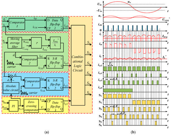 Based on these two working modes, the proposed inverter can adopt the two-objective, three-closed-loop composite control strategy with the energy storage inductor current limit and buffer capacitor average voltage limit. The block diagram and principle waveform are shown in Figure 2. In Figure 2a, the cascaded double loop control composed of the buffer capacitor voltage average outer loop and the input current inner loop realizes the low-frequency ripple suppression of the input current, and the output voltage feedback control loop realizes the stability of the output voltage. In cascade double-loop control, the error of the buffer capacitor voltage average outer loop is amplified by the P regulator to obtain the signal Iiavg*, which is used as the reference value of the input current inner loop and the sum di of the magnetizing mode duty cycle d1 and the energy feed-mode duty cycle d2 in a switching cycle, which is directly obtained by the inner loop of the input current through the single-cycle control. The output voltage loop provides the feed-energy duty cycle d2 through the PI regulator to realize the errorless tracking of the output voltage reference. Both isy0 and isy1 in the control circuit are the output voltage polarity judgment signal and the energy storage inductance current limit signal, respectively.