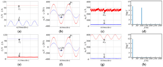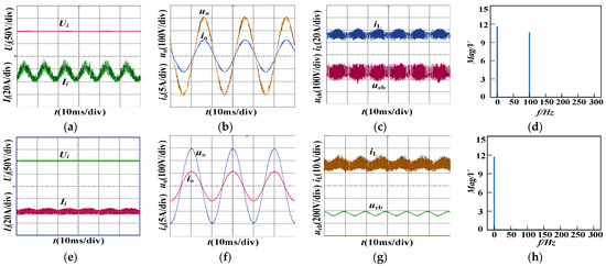 The experimental waveforms of the inverter under the two strategies are shown in Figure 9. Among them, Figure 9a–d represent the experiment waveforms of the proposed inverter using output voltage feedback SPWM control, and Figure 9e–h show the experiment waveforms of the inverter using three-closed-loop composite control that can suppress the low-frequency ripple of the input current. It can be seen from Figure 9 that the proposed inverter under the two control strategies can realize single-stage booster inverters. The three-closed-loop control strategy can realize power decoupling and transfer low-frequency pulsating power on the load side to the buffer capacitor uc, while uc pulsates at twice the frequency near the limit value so as to suppress the low-frequency ripple component of input current and make the input current approximate the DC. It can be seen from Figure 9d,h that the secondary ripple content of the input current before decoupling is 10.13%, and the secondary ripple content of the input current after decoupling is 1.2%.