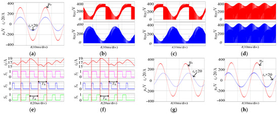 Output full−load simulation waveform: (a) resistive load uo, io; (b) S1, S3 voltage stress; (c) S2, S4 voltage stress; (d) S5, S6 voltage stress; (e) positive half−cycle mode switching; (f) negative half−cycle mode switching; (g) resistive−inductive load uo, io; and (h) resistive−capacitive load uo, io.