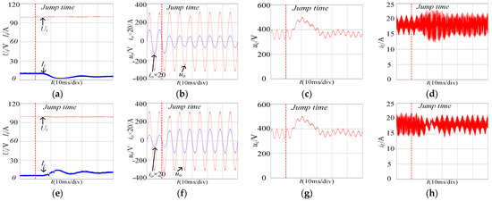 Dynamic simulation waveform of sudden load change: (a) Ui, Ii (1000 W→500 W); (b) uo, io (1000 W→500 W); (c) ucb (1000 W→500 W); (d) iL (1000 W→500 W); (e) Ui, Ii (1000 W→500 W); (f) uo, io (1000 W→500 W); (g) uc (500 W→1000 W); and (h) iL (500 W→1000 W).