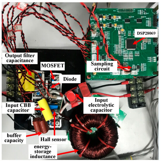 Table 4 shows the comparison of several research schemes. In [21], the proposed scheme uses a thin film capacitor to replace the electrolytic capacitor, which greatly reduces the capacitance value of the buffer capacitor; the inductance parameter is small and has good secondary ripple suppression ability. However, the control strategy is complex, the boost ratio is low, and experimental data such as efficiency, output voltage THD, and dynamic response time are not given. The scheme proposed in [23] suppresses the low-frequency ripple of the input current to a certain extent, but the control method is complex, and the relevant data of the experimental results are not given. The control method used in [24] is relatively simple, the system efficiency is high, and the output dynamic response time is fast when the load changes abruptly. However, the number of energy storage elements is the largest, and the value is the largest, and the experimental data, such as the second harmonic content and the output voltage THD, are not given. In [28], the proposed scheme has fewer components, higher system efficiency, and faster dynamic response time, but the secondary ripple content of the input current and the output voltage THD are relatively high. The control method proposed in this paper is simple: the output voltage THD and input current second harmonic content are low, and the dynamic performance is good, but the system efficiency is low. With the development of the reverse resistance device, the reverse resistance device can be used to replace the MOS tube of the inverter bridge of the proposed circuit in the future, and four blocking diodes can be removed, which significantly reduces the loss of the power device and makes the system’s obtain better overall efficiency.