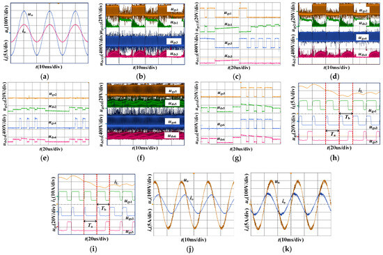 Full-load steady-state experimental waveform: (a) resistive load uo, io; (b) S1, S3 drive and stress; (c) high-frequency expansion of S1, S3; (d) S2, S4 drive and stress; (e) high-frequency expansion of S2, S4; (f) S5, S6 drive and stress; (g) high-frequency expansion of S5, S6; (h) positive half-cycle mode switching; (i) negative half-cycle mode switching; (j) inductive load uo, io; and (k) resistive capacitance load uo, io.
