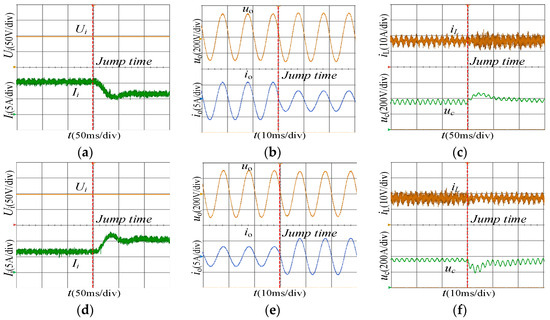 Waveform of load jump experiment: (a) Ui, Ii (1000 W→500 W); (b) uo, io (1000 W→500 W); (c) uc, iL (1000 W→500 W); (d) Ui, Ii (500 W→1000 W); (e) uo, io (500 W→1000 W); and (f) uc, iL (500 W→1000 W).