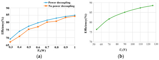 The losses of the proposed converter are mainly inductor loss (copper loss PCu and iron loss PFe) and power device loss (switching loss PSw and on-state loss PS-on). Due to the inductor loss, because the inductor current is dominated by the DC component and the value is large, PCu is much larger than PFe, and the inductor loss is approximately equal to PCu, while PCu basically does not change with the output power Po. In power device loss, PSw depends on the number of switches of the switch action, frequency, voltage stress, and current stress when the circuit mode is switched. PS-on depends on the number of switch conductions, the conduction time, the on-state current, and internal resistance in each circuit mode. Under different Po, the operating modes that switch by each high-frequency switching cycle are roughly the same (i.e., the number of switches working is the same), and the switching frequency and input/output voltage are basically unchanged (i.e., the voltage stress is unchanged). Considering that the inductor current is approximately DC, the influence of other factors is basically unchanged except when the output current causes PS-on increases with Po. Figure 12 shows the efficiency of the system before and after power decoupling under resistive load and the efficiency of the input voltage Ui change under full load. In Figure 12a, the efficiency increases with the increase in output power in both cases. This is because when Po is low, the inherent loss PCu is dominant. As Po increases, the proportion of PCu decreases. Meanwhile, Po increases, and the duty cycle of the magnetization mode and the energy-feeding mode increases, resulting in a significant increase in PS-on, so the rate of increase in efficiency decreases. In addition, because the inverter bridge uses four blocking diodes, which bring a certain proportion of system loss, with the development of the reverse–resistance device, these blocking diodes can be omitted so that the system efficiency can be greatly improved.