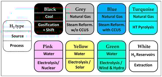 The main supply of hydrogen is currently from fossil fuels via two major routes, which are (i) the steam reforming of natural gas that yields “blue” or “grey” H2, depending on whether the resultant CO2 is captured or not, and (ii) the gasification of coal which leads to “black” (or “brown”) H2. These processes have large CO2 footprints. However, an increasing number of projects are conducted or planned to produce H2 by the electrolytic splitting of water into H2 and O2, using either solar power (“yellow” H2), wind/hydro power (“green” H2), or nuclear power generated during off-peak hours (“pink” or “purple” H2), e.g., using “Gen IV” nuclear reactors. There are currently many such power-to-gas projects implemented or under study to produce hydrogen, giving rise to what is often referred to as the “H2 rainbow” (Figure 1) [1].
