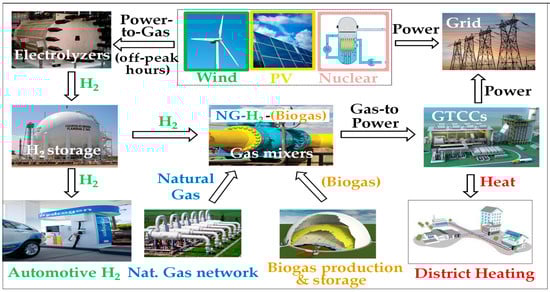 A particularly interesting scenario, as illustrated by Figure 3 [10], lies in the joint deployment of (i) electrolysis units for the production of (green, yellow or pink) hydrogen, (ii) its transportation using existing networks, and (iii) its combustion in power plants, especially in gas turbine combined cycles (GTCCs) or cogeneration units, as these two types of installation today offer the best energy conversion efficiencies.