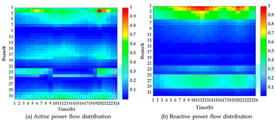 In addition, this example analyzes the branch power flow distribution and node voltage distribution of the distribution network, considering the industrial flexibility of green ammonia, as shown in Figure 3 and Figure 4.