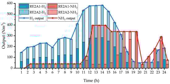 From the perspective of RE2A systems connected at different nodes, the hydrogen production trends of RE2A1 and RE2A2 are similar. In contrast, the ammonia production of RE2A1 is mainly concentrated in the later period, while the ammonia production of RE2A2 is mainly concentrated in the earlier period. This is mainly because hydrogen production is closely related to the output trend of renewable energy, and there are hydrogen storage tanks in the process from the completion of hydrogen production to ammonia synthesis, and the optimal time period for ammonia production at different nodes can be determined according to the network loss of the line.