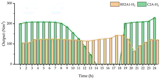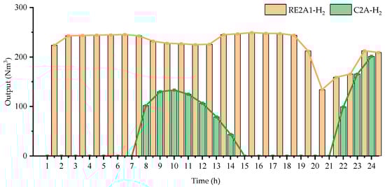 Compared with the C2A system, the biggest advantage of the RE2A system is that it is clean and low-carbon. Figure 6 and Figure 7, respectively, show the production of hydrogen under the low-hydrocarbon constraint and under the clean and renewable hydrogen constraint.