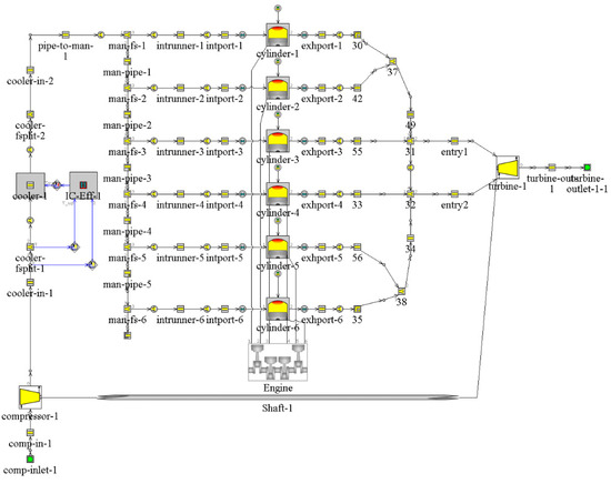 The numerical simulation model of a six-cylinder diesel engine is constructed using the GT-Power module in GT-Suite software. The technical parameters of the engine are presented in Table 1.
