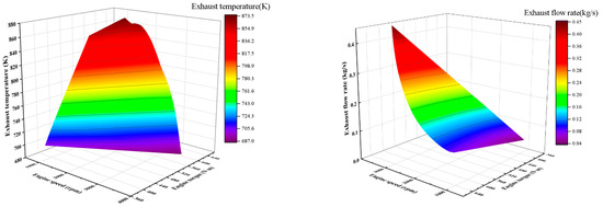 Simulation results of the impact of engine operating conditions on the variation in engine exhaust temperature and exhaust mass flow rate is illustrated in Figure 2.