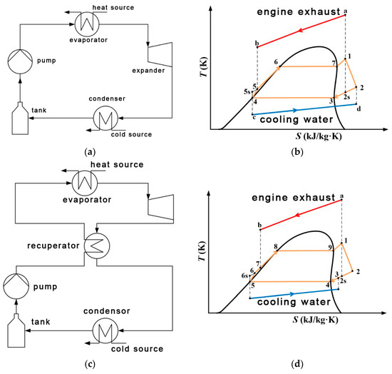 The schematic process diagram and the temperature entropy diagram of the RORC are presented in Figure 3c and Figure 3d, respectively. The pump pressurizes the saturated working fluid from the storage tank, which flows into the recuperator (point 5 to point 6 indicates the actual pressurization process, point 5 to point 6s indicates the ideal pressurization process). In the recuperator, the low-temperature working fluid exchanges heat with the spent gas after doing work from the expander (point 6 to point 7 indicates an isobaric heat-absorbing process), then the organic working fluid flows into the evaporator and exchanges heat with the diesel exhaust, absorbs the residual heat energy of the exhaust, and converts it into saturated or superheated vapor (point 7 to point 1 indicates an isobaric evaporation process), and following the evaporation, the working fluid outputs the mechanical work by undergoing an expansion process within the expander, (point 1 to point 2 indicates the actual process of expansion, point 1 to point 2s indicates the ideal process of expansion). After expansion, the spent gas exchanges the heat with the low-temperature working fluid pressurized by the working fluid pump within the recuperator, which plays a role in preheating the organic working fluid (point 2 to point 3 indicates the role of an isobaric exothermic process), after which it exchanges heat with the cooling water within the condenser and becomes saturated (point 3 to point 5 indicates the isobaric condensation process), and the working fluid ultimately enters into the tank and is pressurized, as a cycle is completed. A more detailed description of the SORC and RORC, including their mathematical models, can be found in [27].