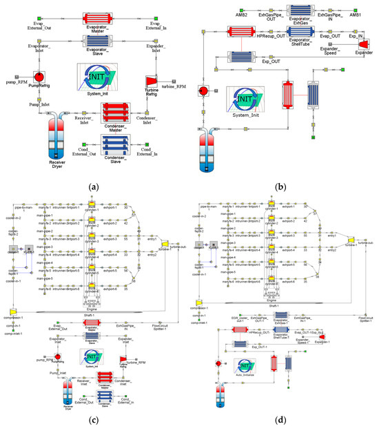 SORC, RORC, and engine-coupling SORC and RORC numerical simulation models. (a) Simulation model of SORC system, (b) Simulation model of RORC system, (c) Simulation model of SORC system for engine waste heat recovery, (d) Simulation model of RORC system for engine waste heat recovery.