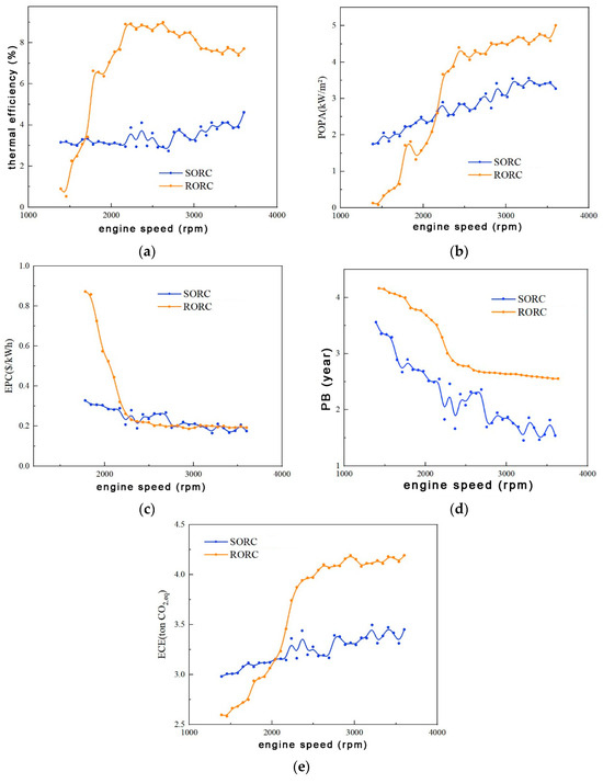 Engine speed is one of the important factors affecting the exhaust waste heat characteristics. Figure 5 illustrates the performance objective functions of the SORC/RORC system at different engine speeds with constant model parameters.