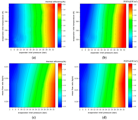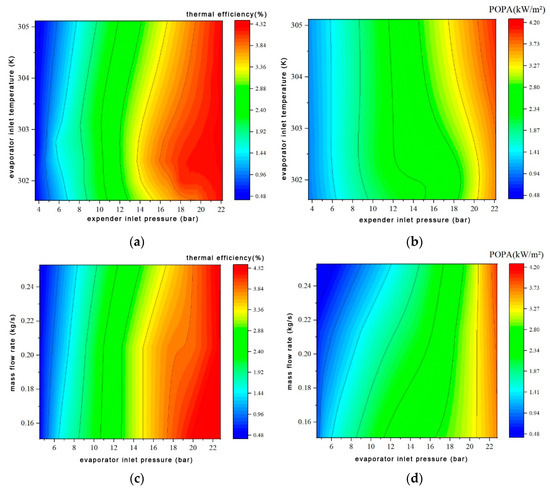 Influence of SORC system operating parameters on thermodynamic performance. (a) Influence of expander inlet pressure and evaporator inlet temperature on thermal efficiency, (b) Influence of expander inlet pressure and evaporator inlet temperature on POPA, (c) Influence of working fluid mass flow rate and evaporator inlet pressure on thermal efficiency, (d) Influence of working fluid mass flow rate and evaporator inlet pressure on POPA.