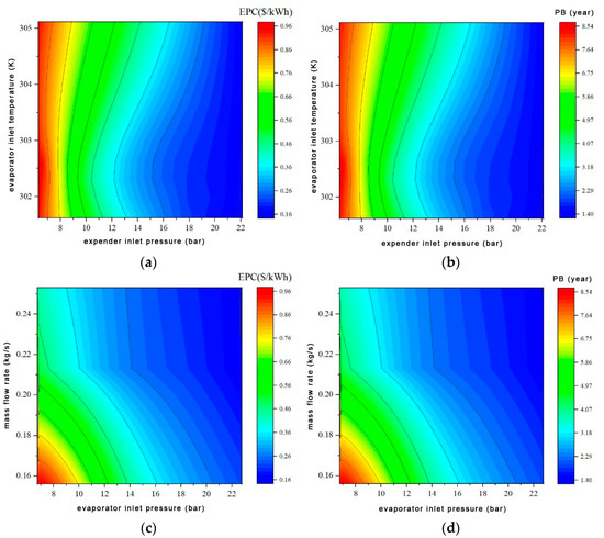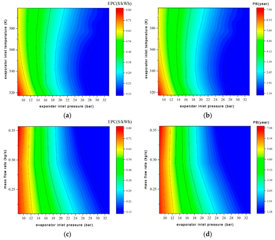 Influence of RORC system operating parameters on economic performance. (a) Influence of expander inlet pressure and evaporator inlet temperature on EPC, (b) Influence of expander inlet pressure and evaporator inlet temperature on PB, (c) Influence of working fluid mass flow rate and evaporator inlet pressure on EPC, (d) Influence of working fluid mass flow rate and evaporator inlet pressure on PB.