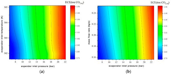 Influence of SORC system operating parameters on environmental performance. (a) Influence of expander inlet pressure and evaporator inlet temperature on ECE, (b) Influence of working fluid mass flow rate and evaporator inlet pressure on ECE.