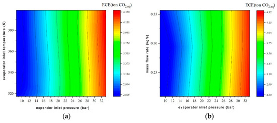 Figure 11 shows the impact of RORC operating parameters on environmental performance. The RORC system’s ECE are significantly affected by the expander inlet pressure and evaporator working fluid side inlet pressure, which are generally positive correlated. The inlet temperature of the evaporator’s working fluid side and the working fluid mass flow rate have small influences on the ECE of the RORC within the parameter variation range. The RORC system exhibits ECE values ranging between 4.32 ton CO2,eq and 2.81 ton CO2,eq in the simulation.