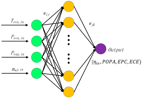 In this paper, 500 data sets each of the SORC and RORC were generated by GT-Suite simulation in a practical range of operating parameters. The data were split into a training set and a test set. In the training phase, the training set was used to train the parameters such as weights and thresholds in the neural network structure. In the testing phase, the test set was used to test the trained neural network. The neural network uses the evaporator working fluid side inlet temperature and inlet pressure, expander inlet pressure, and working fluid mass flow rate as input variables, and the thermal efficiency, POPA, EPC, and ECE of the system as output variables. The values of the input and output variables were normalized. The number of training iterations was set to 500.