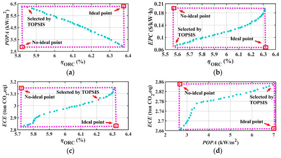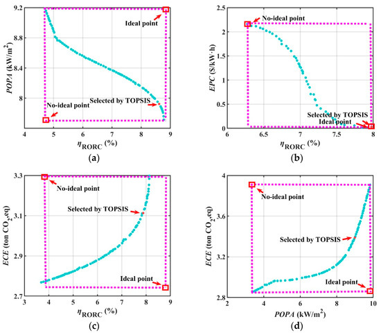 The RORC optimization results of selecting the thermal efficiency and POPA combination is presented in Figure 14a. This figure illustrates that the POPA tends to decrease as the thermal efficiency increases, and there is a negative correlation between the two, which due to the same reason as in the SORC, increasing the thermal efficiency of the system requires increasing the heat exchange area of the heat exchanger. The thermal efficiency and POPA are in a competitive relationship during the optimization process. The optimal solution selected by the TOPSIS method had a thermal efficiency of 8.61%% and a POPA of 7.92 kW/m2. The optimization results of selecting the thermal efficiency and EPC combination are presented in Figure 14b. They show that the EPC tends to decrease as the thermal efficiency increases, and the two have a negative correlation. The optimal solution selected by the TOPSIS method had a thermal efficiency of 7.88% and an EPC of 3.15 × 10−2 USD/kWh. The optimization results of selecting the thermal efficiency and ECE combination is presented in Figure 14c. It shows that the ECE tends to increase as the thermal efficiency increases, and the two are positively correlated, which is mainly affected by the circumstances, such as when more working fluid is charged and the change in the heat exchanger specifications. The optimal solution selected by the TOPSIS method had a thermal efficiency of 7.88% and an ECE of 3.11 ton CO2,eq. The optimization results of selecting the POPA and ECE combination are presented in Figure 14d. They illustrate that the ECE tends to increase as the POPA increases, and the two are positively correlated. This is also mainly affected by the change in circumstances. The optimal solution selected by the TOPSIS method had a POPA of 8.99 kW/m2 and an ECE of 3.39 ton CO2,eq.