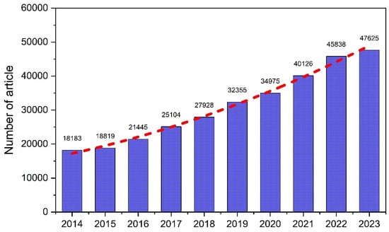 Number of published scientific articles on the alternative and renewable energy sector in the period of 2014–2023 (from Scopus accessed on 26 July 2024).
