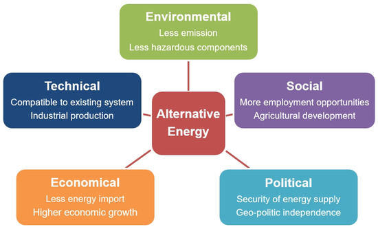 In addition to technical and environmental aspects, the increasing call for alternative energy for sustainable application is also driven by social, political, and economical aspects. In social aspects, the generation of alternative fuels can expand the employment opportunities and develop the advanced agricultural ecosystem [7,11]. Then, the political aspect considers the strengthening of energy supply security and the affirmation of geographically based political independence as the basis for enforcing the sustainable energy application [7,11]. Meanwhile, the economical point of view emphasizes the reason for energy import reduction and economic growth to functionalize self-produced environmentally friendly energy [3,12]. All considerations in every aspect are summarized in the diagram shown in Figure 2.