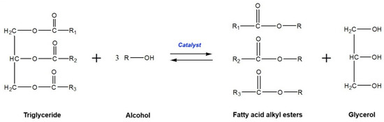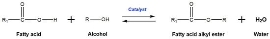 Generally, biodiesel is synthesized by transesterification or esterification processes. The former process generates biodiesel from triglyceride-rich feedstocks (such as vegetable oils, fats, and used cooking oils) and short-chain alcohols using a basic or acidic catalyst [21]. In this process, the glyceride-attached fatty acids are taken out, promoting alkyl ester monomers, and replaced by an alcohol functional group to form glycerol as a by-product. The general reaction formula of transesterification is presented in Figure 3. In the other method, the esterification process requires free fatty acid-rich feedstocks (such as fatty acid distillates) and short-chain alcohols to produce biodiesel in the existence of an acidic catalyst [22]. In this reaction, the activated methoxy component attacks the carboxylic acid functional group in the free fatty acid to produce a mono-alkyl ester and water as by-products. The appropriate formula of the esterification reaction is shown in Figure 4.