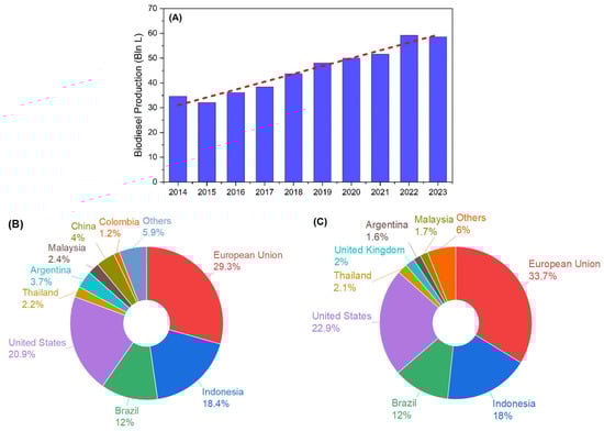Current situation of biodiesel: (A) global biodiesel production in 2014–2023 (red line is production trendline); (B) distribution of biodiesel producers in 2023; (C) distribution of biodiesel consumers in 2023 (data were obtained from [164,165]).