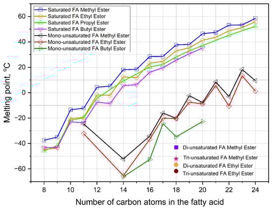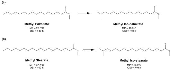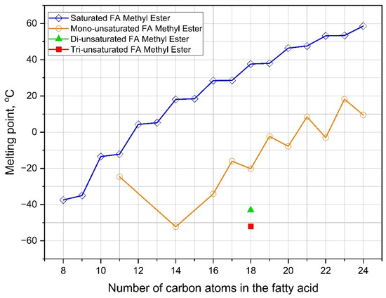 - Yao, L.; Hammond, E.; Wang, T. Melting Points and Viscosities of Fatty Acid Esters that are Potential Targets for Engineered Oilseed. J. Am. Oil Chem. Soc. 2008, 85, 77–82. [Google Scholar] [CrossRef]