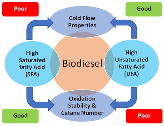 Generally, biodiesel feedstocks can be obtained from various resources depending on their abundance in a region or country. The amazing diversity in biodiesel feedstocks can be seen in Table 2, which is divided into several generation and categories. Each feedstock has a specific fatty acid profile and these differ from each other [7], as shown in Table 4. These fatty acids can be classified into two categories, namely saturated fatty acid (SFA) and unsaturated fatty acid (UFA) [169]. SFA is defined as a fatty acid component without a double bond in the carbon chain. It is generally symbolized with Cx:0 (x denotes the number of carbon chains and 0 indicates there is no double bond in the carbon chain). The major SFAs found in vegetable oils are palmitic acid (C16:0) and stearic acid (C18:0). Furthermore, UFA represents a double-bond fatty acid component and its acronym is Cx:y (y indicates the number of double bonds in the carbon chain). Then, UFA is divided again into two sub-categories, mono-unsaturated fatty acid (MUFA) for a single double-bond fatty acid component and poly-unsaturated fatty acid (PUFA) for more than one double bond in the fatty acid carbon chain [169]. The examples of MUFA compounds in biodiesel feedstocks are oleic acid (C18:1) and palmitoleic acid (C16:1). Meanwhile, linoleic acid (C18:2) and linolenic acid (C18:3) are the top two PUFA components mostly found in the fatty acid ester feedstocks.