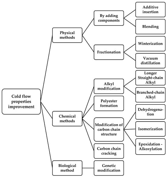 - Sierra-Cantor, J.F.; Guerrero-Fajardo, C.A. Methods for Improving the Cold Flow Properties of Biodiesel with High Saturated Fatty Acids Content: A Review. Renew. Sustain. Energy Rev. 2017, 54, 1401–1411. [Google Scholar] [CrossRef]