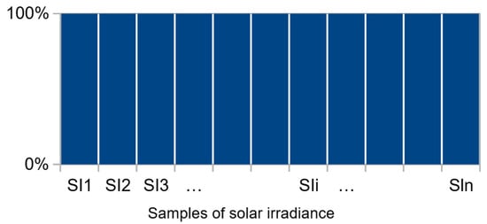 SISF reaches values between 0 and 1, so a completely (theoretically) stable level of solar irradiance with a factor of 1 is only a hypothetical and theoretical value. This means that the intensity of solar irradiance is constant in the observed time interval—the size of all samples is equal to the maximum sample. In reality, if we observe a more extended time interval (e.g., hours), the scenario with is only observed in the universe or the far north or south of the earth around the summer solstice, when the sun shines evenly throughout the day. In general, such situations are rare on Earth. Figure 1 shows a case where all samples of solar irradiance in the observed time frame are equal and thus correspond to the maximum value in the observed time frame.