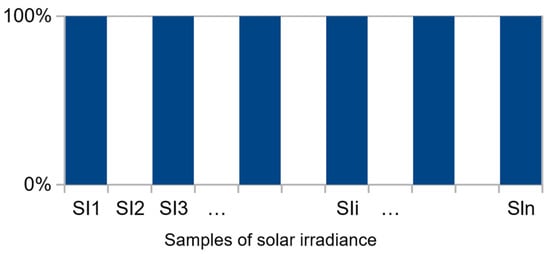 On the other hand, the value of is also only hypothetical in practice. In the observed time interval, the samples follow the solar irradiance so that the sun “shines” with its maximum intensity at some points and with its minimum intensity at others. In other words, every second sample corresponds to the maximum sample, while the intermediate samples are identical to the minimum sample. This case is illustrated in Figure 2, where every second sample of solar irradiance in the observed time frame corresponds to the maximum value, and the others are equal to 0 (or minimum).