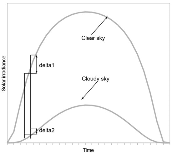 Solar irradiance in clear (with lower stability) and cloudy (with higher stability) sky conditions with more extensive and smaller differences between solar irradiance size samples. Source: Ref. [33].
