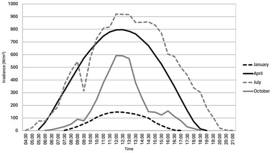 Solar irradiance distribution on 1 January, 1 April, 1 July, and 1 October in Ljubljana (with a latitude of about 46° north) in the same year. Source: Ref. [33].