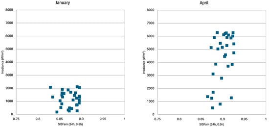 So far, we have calculated the values (with 24 h, we cover all samples greater than 0) for each whole month. We have observed January, April, July, and October of the same year. can be calculated daily, and its value can be examined within a month. The graphs for the months are shown in Figure 5. The mean values and standard deviations of and the amount of energy received per month are shown in Table 3. Such graphs (see Figure 5) are useful for quickly assessing the dispersion of solar irradiance stability and the quantity of energy produced for a specific geographical area by individual months (the observed time period could also differ).