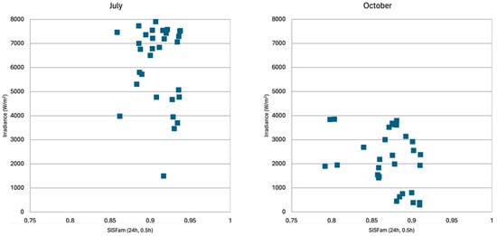 has the lowest value on 6 July and is slightly larger on 3 July. In Figure 6, we see that the length of the lines representing the oscillation of solar irradiance (especially between 10:00 and 17:00) is slightly greater on 6 July than on 3 July. This means that the sum of the oscillation lengths is slightly greater on 6 July than on 3 July, while the maximum patterns are similar in both cases. 27 July has the best value of , as the differences between samples are relatively small. The stability factor on 27 July is not close to 1, contrary to what would be expected for factors defined based on the difference between the observed solar irradiance and the open sky irradiance in this particular “near open sky” solar irradiance curve.