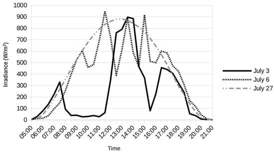 Daily distributions of solar irradiance in Ljubljana for 3, 6, and 27 July in a year. Source: Ref. [33].