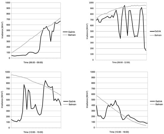In the following example, all three SISFs are shown using data from Bahrain and Slovenia (Gačnik, a few kilometers from Maribor, with continental climate conditions). The intervals between measurements are 5 min (300 s), and a day is divided into four equivalent 3 h time windows starting at 6:00, 9:00, 12:00, and 15:00. The solar irradiance during each of these time windows is shown in Figure 7.