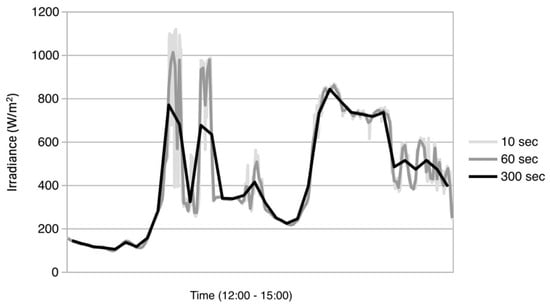 Figure 8. Representation of solar irradiance using different (10, 60, and 300 s) time samples. Source: own elaboration. - We have more samples within a given observed time interval with a decrease in the time difference between the samples. The number of these samples is represented in Table 7 in the column labeled ‘N − 1’. As their number increases, the values of SISFs converge towards 1, which arises from the definition of SISF itself.