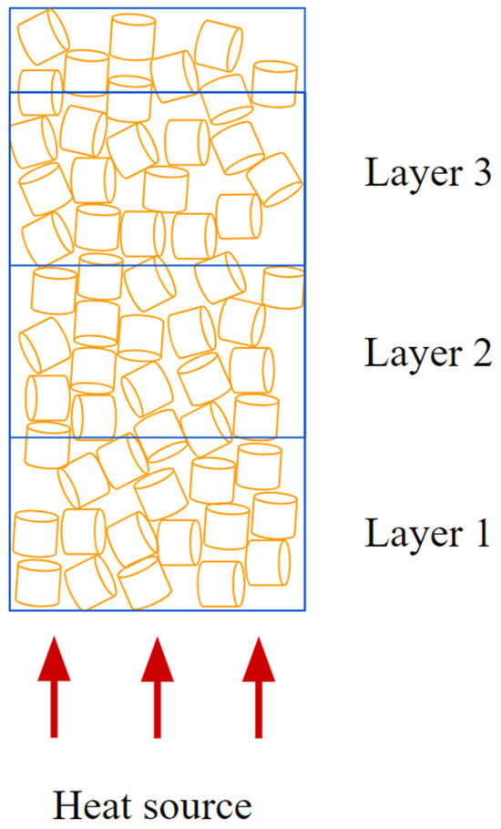 Most solar power research has focused on fine-grained materials, primarily spherical in shape, which often require substantial production costs. In contrast, naturally extracted granular material particles tend to have irregular shapes [9]. It is widely recognized that the packing structure of the granular bed significantly affects the heat storage efficiency [10,11,12]. In CSP systems, key components such as receivers, thermal storage units, and moving bed heat exchangers rely on slowly moving or stationary packed particle beds. Even in moving beds, the relatively slow particle motion allows for their approximation as packed beds during short time intervals. The heat transfer mechanism in powder-based CSP systems primarily relies on conduction and radiation, with a minimal contribution from convection due to the absence of forced gas flow through particle beds in thermal storage units and moving bed heat exchangers. Radiation heat transfer within powder beds, particularly those containing non-spherical particles, is a complex phenomenon influenced by factors such as particle shape, size distribution, and packing arrangement [5,13]. The irregular geometries of non-spherical particles introduce variability in radiative interactions, complicating the accurate modeling and quantification of radiation heat transfer in these systems. In the present study, we focused on conduction as an essential mode of heat transfer, with particle contact areas and orientations playing critical roles in determining the overall thermal resistance and system efficiency. Conduction through particle contacts is the primary heat transfer mechanism, especially in conditions where the particle proximity enhances solid-to-solid conduction. Moreover, as discussed by Su [14], the effective thermal conductivity within the bed is significantly influenced by the pellet number density and porosity, both of which have distinct effects on temperature distribution patterns. Moghaddam et al. [12] investigated the impact of various particle geometries, including spheres, rings, and cylinders, on the wall-to-bed heat transfer. They found that the effective radial thermal conductivity was higher for the packings of cylinders and Raschig rings compared to the packings of spheres.