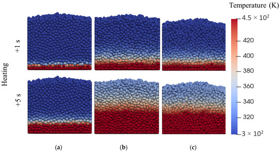 Figure 4. Temperature distribution in packed beds of (a) spheres, (b) ellipsoids, (c) and cylinders at 1 s and 5 s.