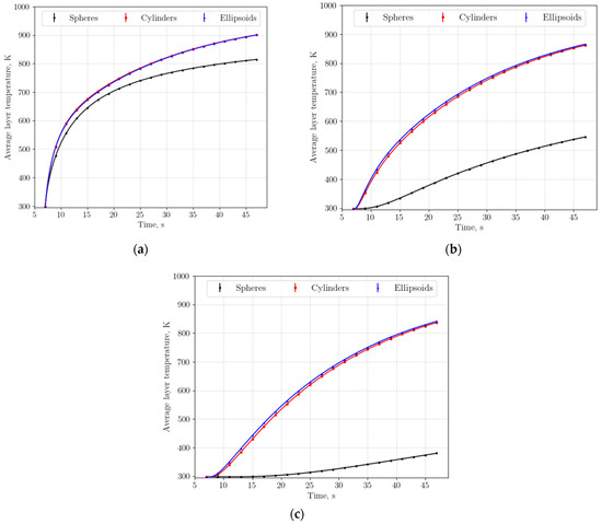 Figure 5. Temporal evolution of average layer temperature: (a) layer 1, (b) layer 2, and (c) layer 3 for spherical, ellipsoidal, and cylindrical particles.