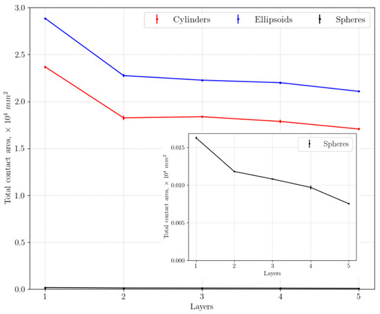 Figure 6. Total contact area in each layer for compacts of spherical, ellipsoidal, and cylindrical particles.