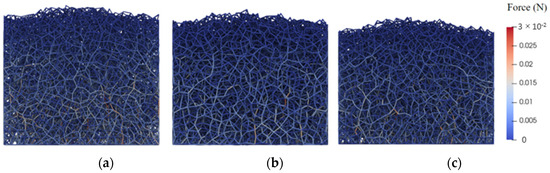 Figure 7. The force chain of (a) spherical, (b) ellipsoidal, and (c) cylindrical particles.