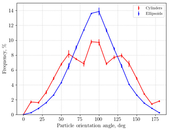 Figure 8. Distribution of particle orientation angle for cylindrical and ellipsoidal particles.