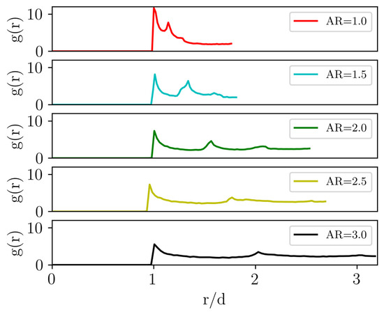 Figure 10. RDF of cylindrical particle compacts normalized by particle diameter.